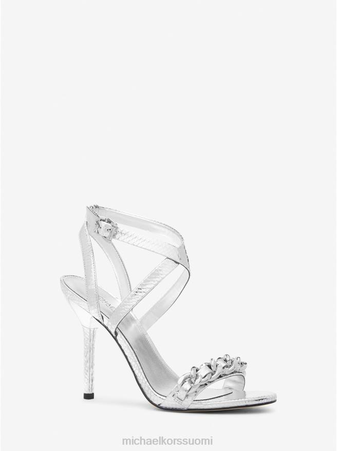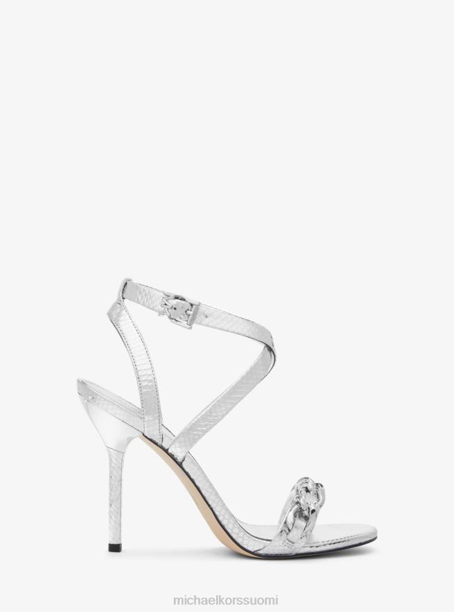 treffi-illasta juhlallisiin tilaisuuksiin – asha-sandaalimme ovat valmiita rsvp-valmiiksi. käärmeen kohokuvioitu nahka ja ketjulenkkien koristeet tarkoittavat, että ne kääntävät päänsä välittömästi, kun taas galvanoitu tikkakorko lisää huimaa korkeutta. pue omasi kauden minimekkoihin.