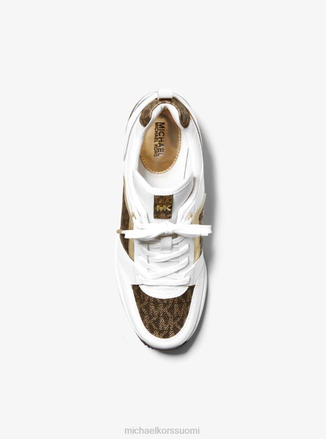 sekoita: metallisen signatureprint canvas- ja nahkapaneelit tekevät georgie-tennareistamme urheilu-luxe-parin, joka on täydellinen kaikkiin vapaapäiviin. Kiilakorkoon kiinnitettynä ne näyttävät yhtä tyylikkäiltä leuhkeiden hameiden kuin farkkujen kanssa.