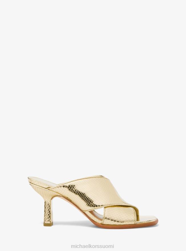 gideon-muulit ovat täydellisessä tasapainossa glamourin ja mukavuuden välillä. Tämä käärmekuvioitu nahkapari on asetettu tukevalle kitten kantapäälle, ja sitä määrittelevät leveät ristikkäiset olkaimet ja tyylikäs nelikulmainen varvas. korosta metallista viimeistelyä yhteensopivalla käsilaukulla.