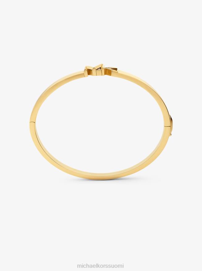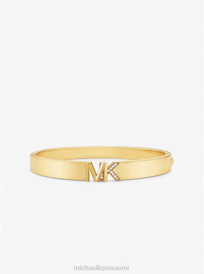 tämä rannerengas on tyylikäs, mutta samalla näyttävä. se on valmistettu 14 karaatin kullatusta messingistä ja keskellä on kivellä päällystetyt logon nimikirjaimet. saranoitu suljin varmistaa, että saat sen päälle ja pois helposti.
