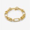 saa inspiraationsa rakkaan Hamilton-laukumme laitteistosta. Tämä 14k kullattu messinkirannekoru on päällystetty kolmella kivetysrivillä ja viimeistelty riippulukkokorulla. saranoitu nappikiinnitys helpottaa pukemista päälle ja pois.
