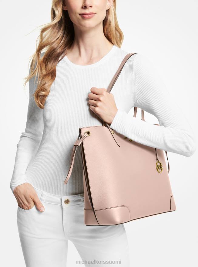 jossa on juuri tarpeeksi rakennetta ja tilava sisustus. Edith-kangaskassi on välttämätön ympärivuotisessa työmatkalla. Tässä saffiano-nahkaisessa kantolaukussa on irrotettava vetoketjullinen pussi pienten esineiden kiinnittämiseen sekä siteet sivuilla helpottamaan laajentamista. tartu siihen, niin voit kuljettaa kaiken, mitä tarvitset työhön tai nopeaan matkaan.