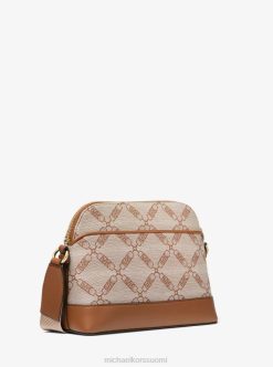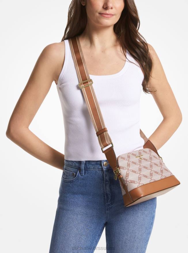 tämä rento crossbody-laukku on kudottu empire-logokuvion kanssa. se on renderöity strukturoiduksi kupuksi sileillä keinonahkakoristeilla, ja siinä on säädettävä hihna ja kätevä takatasku.