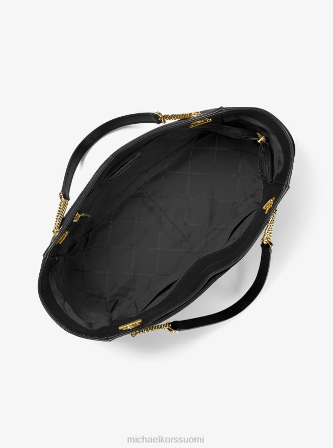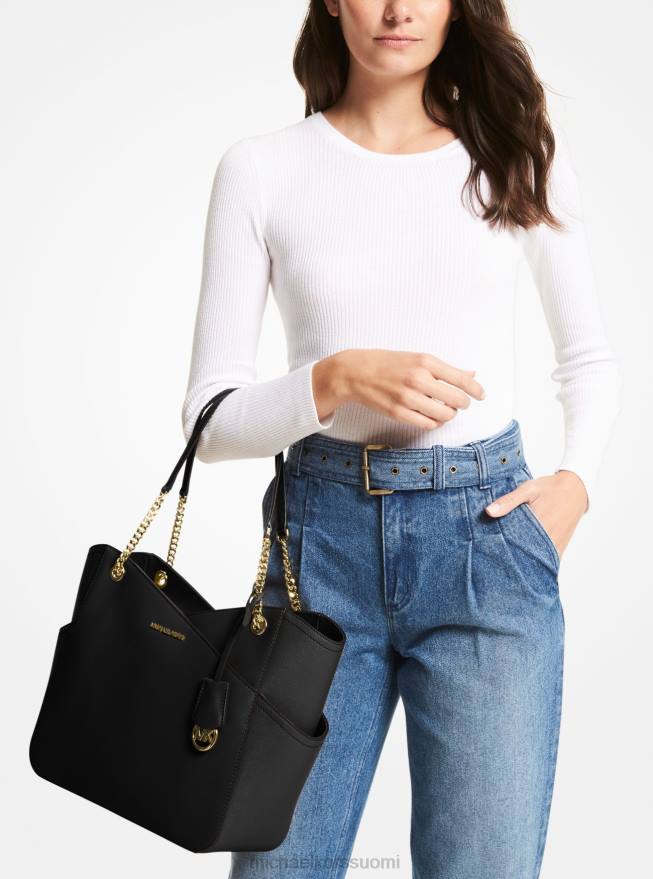 seikkailuihin tarkoitettu saffiano-nahkainen jet-olkalaukku tuo arkkitehtonista tunnelmaa jokapäiväiseen ilmeeseen. kätevät sivutaskut ja turvallinen ylävetoketju tekevät tästä kantolaukusta täydellisen matkakumppanin, ja tilavassa sisustuksessa on enemmän kuin tarpeeksi tilaa päivittäisille tavaroillesi.