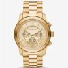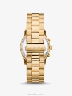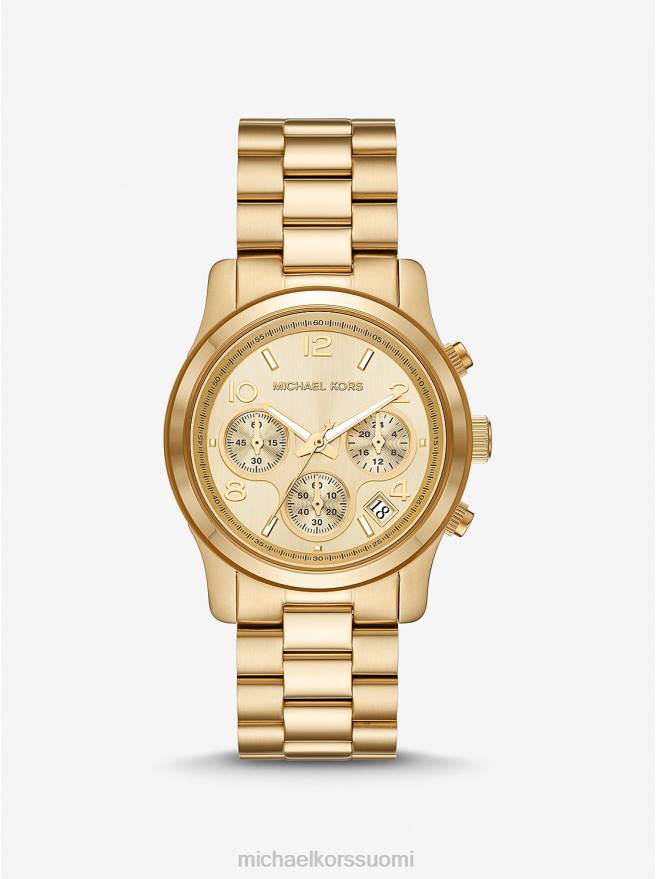 täydellinen viimeistely jokaiseen asuun. Uusi runway-kellomme on suosikki tulevina vuosina. Tämä tyylikäs tyyli on päivitetty korotetuilla apukelloilla, ja se on valmistettu kullanvärisestä ruostumattomasta teräksestä, jossa on kiillotettu rannekorun hihna, ja siinä on kronografiyksityiskohdat tarkkaa ajankäyttöä varten.