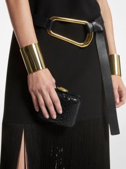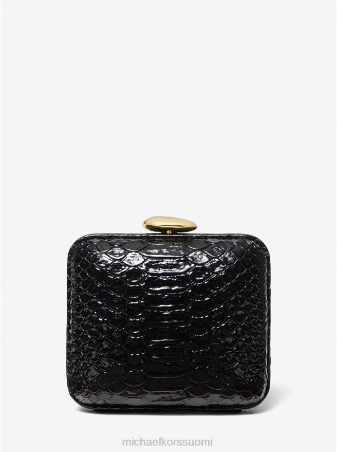tyylin huippu pienessä paketissa, tina mini minaudieremme teki debyyttinsä kevään/kesän 2023 kiitoradalla. Siinä on tyylikäs kiven muotoinen yläosa, se on leikattu silmiinpistävästä python-kohokuvioidusta nahasta ja muotoiltu strukturoidulla siluetilla tyylikkään ja minimalistisen viimeistelyn saavuttamiseksi. kiillotettu ketjuhihna mahdollistaa sen kantamisen useilla eri tavoilla tehden siitä täydellisen illanviettokumppanin. valmistettu italiassa.