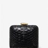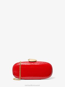 jossa on tyylikäs kiven muotoinen yläosa. Moderni tina minaudiere on tyylikäs linja ja irrotettava ketjuhihna. se on valmistettu krokotiilikohokuvioidusta nahasta kiiltävällä viimeistelyllä ja varustettu täyteläisellä mokkanahkavuorauksella – se täydentää täydellisesti sekä tuulista mekkoja että räätälöityjä pukuja.