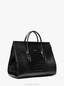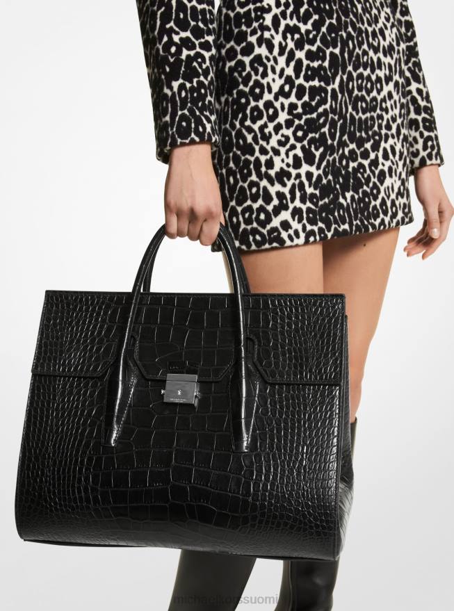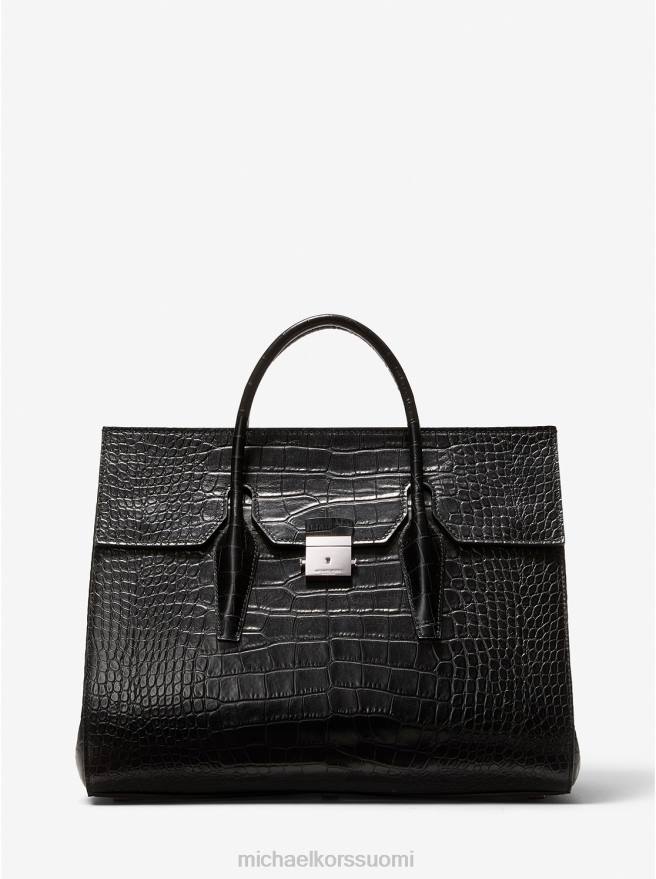 valmistettu Italiassa krokotiilikuvioidusta vasikan nahasta. Virtaviivainen campbell-viikonloppulaukku on tutkielma hienostuneisuutta. elegantti lukko avautuu ylellisen tilavaan sisustukseen, joka on vuorattu vuohen mokkanahalla, ja sisätaskut pitävät välttämättömät tavarat käsivarren ulottuvilla. Tämä laukku on viimeistelty mukavilla ja upeasti tehdyillä yläkahvoilla, joten matkustat aina tyylikkäästi.