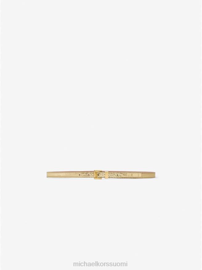 valmistettu italiassa, tämä vyö on ammattitaidolla valmistettu metallista krokotiilikuvioidusta nahasta ja kiinnittyy kiillotetulla neliömäisellä soljella. pujota kapea vyö suosikkihousujen silmukoiden läpi tai strukturoidun bleiserin vyötärölle