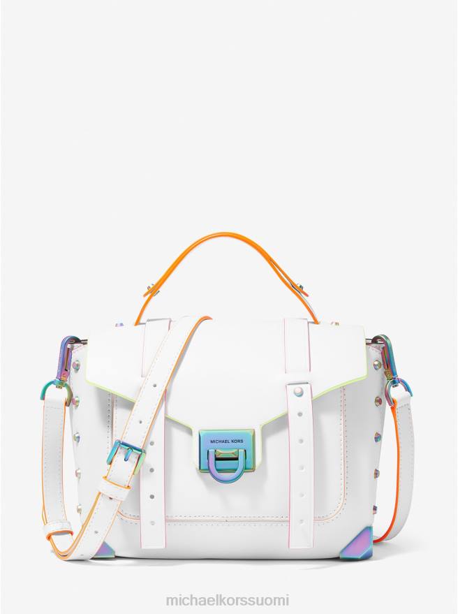 manhattan-laukku tuo modernia vetovoimaa klassiseen tavaralaukkutyyliin. Taidokkaasti valmistettu sileästä italialaisesta nahasta ja neonkontrastiverhoilusta, se on määritelty värikkäillä metallikulmilla ja erottuvilla nastoilla. flip-lock-suljin avautuu ja paljastaa ulkoisen etutaskun, josta pääset helposti käsiksi puhelimeesi.