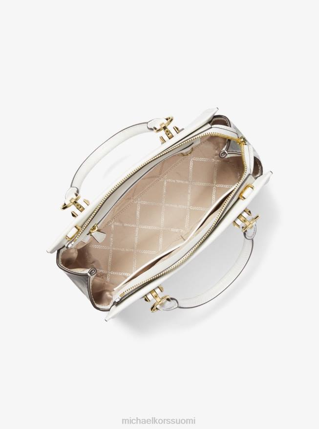 kompakti kumppani, jossa on tarpeeksi tilaa kaikelle olennaiselle, jäsennelty marilyn-laukkumme on hienostuneen helppouden ruumiillistuma. Se on valmistettu sileästä nahasta krokotiileilla koristeltuilla korosteilla, ja se avautuu vuoratuun sisäosaan, jossa on erilliset taskut puhelimelle, lompakolle ja muille pienille tavaroille. kiinnitä mukana toimitettu hihna käyttääksesi sitä ristissä.