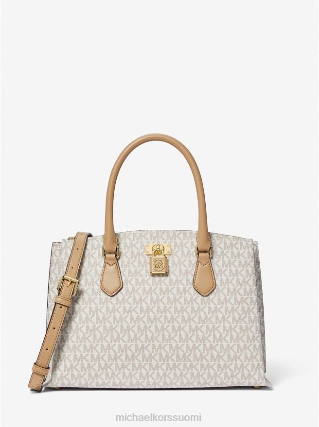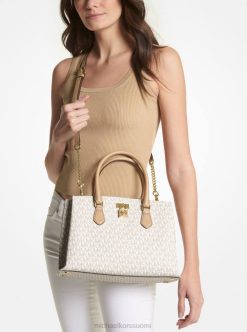 joka määrittelee sen muodokkaan siluetin ja harmonikkakiinnityksellä, rubiinilaukku määrittelee uudelleen arjen eleganssin. se on valmistettu tyylikkäästä allekirjoitusprinttikankaasta, ja siinä on koristeellinen riippulukko, johon on kaiverrettu ikoninen mk-hyötymys. rakastamme, kuinka lokeroitu sisätila järjestää fiksusti päivän tärkeimmät tavarat.