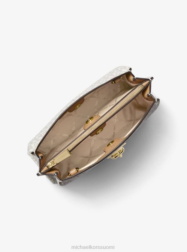 allekirjoitettu rubiinikuviomme on minimalistinen muotoilu, joka erottuu koristeellisesta kiillotetusta riippulukosta. Se on mitoitettu sopimaan arjen välttämättömiin tarpeisiin, ja siinä on vuorattu sisäpuoli, jossa on vetoketjullinen keskitasku ja irrotettava crossbody-hihna. Yhdistä se helppokäyttöisten vaatekaappien kanssa saadaksesi ilmeen, joka huokuu vaivatonta tyyliä.