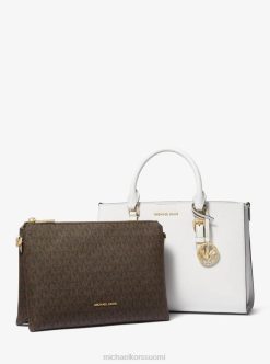 glamouria on laukussa 2-in-1-sally-laukussamme, joka sisältää irrotettavan signatureprintin sisäpussin. saffiano-nahka ja kultainen laitteisto muodostavat ylellisen yhdistelmän, kun taas säädettävä hihna helpottaa kantamista poikki. rakastamme sitä, kuinka pussi toimii matkustusvarusteena pitkillä lennoilla.
