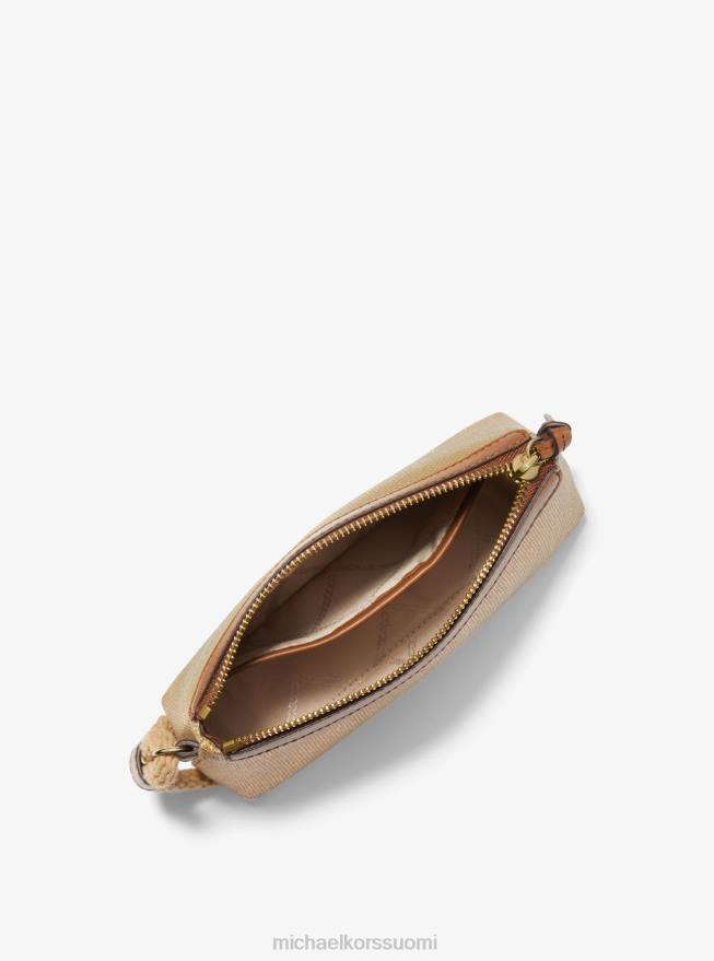 suunniteltu metalliseen puuvillakankaaseen, jossa on sileät aksentit. Talia-ranneke on rikas rakenne ja viehätys. se avautuu vetoketjulla suljettavaksi pussiksi, jossa on liukutasku, johon mahtuu helposti käsiksi tarvittavat tavarat. kanna sitä köysihihnasta niinä päivinä, kun haluat matkustaa kevyesti.