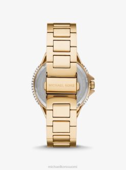 ylikokoinen camille-kellomme löytää täydellisen tasapainon rohkean ja elegantin välillä. Tässä modernissa kullanvärisessä kellotaulussa on häikäisevän sininen kellotaulu, ja se on upotettu yhdistelmällä päällystysaksentteja ja patonkikiviä lisäämään glamouria. kurkota se valaisemaan ilmettäsi välittömästi.