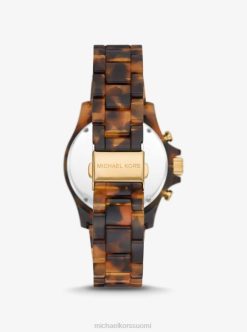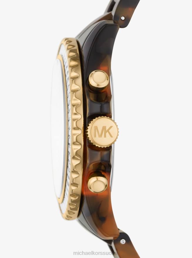 kestävyyttä ajatellen, tämä kilpikonnankuoren värinen everest-kello on valmistettu 76 % biopohjaisesta asetaatista ja 50 % kierrätetystä kullanvärisestä ruostumattomasta teräksestä. valoa vangitsevat patonkikivet lisäävät ylellistä viimeistelyä, kun taas kronografitaulut ja päivämääräikkuna varmistavat tarkan ajanoton. pinoa se ranteeseesi käsivarsi täynnä koruja.