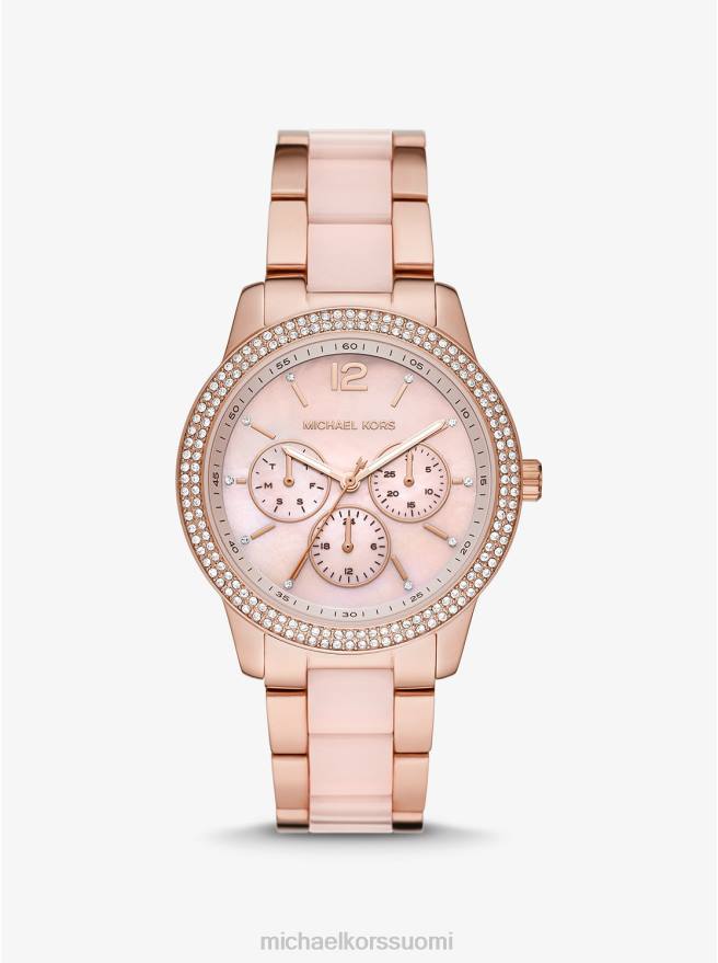 moderni päivitys himoituneeseen tibby-kelloimme. Tässä tyylissä on elegantti helmiäispinta, jota ympäröi ylellinen päällystys. se on valmistettu ruusukullan sävyisestä ruostumattomasta teräksestä ja korostettu vaaleanpunaisilla asetaattikeskilinkeillä naisellisen kierteen saamiseksi. pudota se ranteesi antaaksesi välitöntä kiillotusta mihin tahansa asuun.