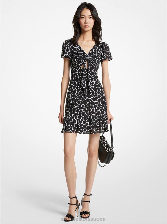 rennon tyylikäs mekko auringonnoususta auringonlaskuun. Tämä mekko on leikattu georgettesta, joka on mukava ja kevyt. siinä on istuva liivi, jossa on solmittava etuosa ja leikkaus, joka paljastaa ihon välähdyksen, sekä rypytetty helma liikkumista varten. sovita käsilaukkusi kirahvikuvioiseen kuvioon seuraavaa juhlaa tai tapahtumaa varten.