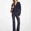 aukimainen käänne muuttaa tämän resorineuletakin tavallisesta erikoiseksi. se on valmistettu kierrätetystä viskoosiseoksesta ja kiinnitetään kiiltävällä napilla, joihin on kaiverrettu merkin nimikirjaimet. korosta v-pääntie kaulakorulla.