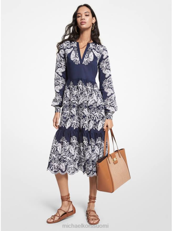 tämän puuvillamekon kumpuileva siluetti näyttää yhtä tyylikkäältä uima-altaan äärellä kuin ulkona ruokailuun. kämmenkirjonta lisää kaftaanin inspiroimaan muotoiluun pakopaikan viehätysvoimaa, kun taas runoilijahihat ja uurrettu helma luovat romanttista ilmettä. käytä sitä minimaalisella meikillä ja pörröisillä hiuksilla jatkaaksesi vaivatonta tunnelmaa.