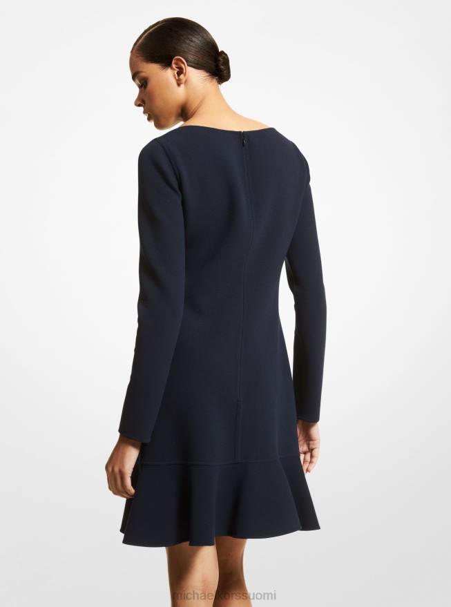 tämä röyhelöillä koristeltu minimekko määrittelee eleganssin uudelleen. Italiassa räätälöity neitsytvillasta, jossa on aavistus joustavuutta, ja siinä on klassinen venepääntie, joka reunustaa kauluksen luuta ja laskeutuu vyötärön siluettiin. keskiyönsininen sävy näyttää parhaiten tyyliteltynä kauden kastanjapumpuilla ja käsilaukulla.