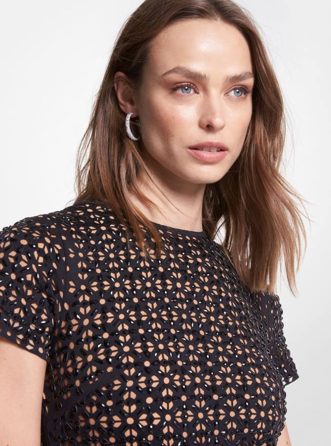 tapaa mekko, jota kaikki kaipaavat tällä kaudella. se on suunniteltu urheilullisesta sukellusta laserleikatulla geometrisella kuviolla, joka on koristeltu jalokivillä. lyhyet hihat ja minipituus pitävät siluetin yksinkertaisena mutta erottuvana. tuo esiin monimutkainen muotoilu minimaalisilla lisävarusteilla.