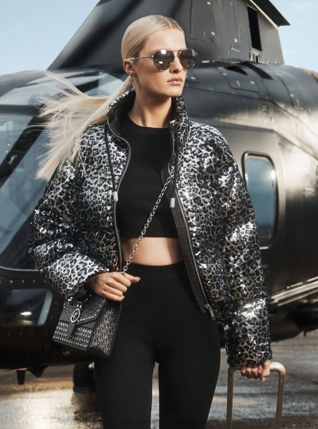 tyylikäs tyttö-lähestymistapa ja yhdistä paljeteilla koristeltu takki, joka vangitsee valon jokaisella liikkeellä. tämä leikattu puffer-tyyli on leikattu kierrätetystä satiinista, kun taas hohtavat paljetit luovat leopardikuvioisen kuvion. sovita korusi metallinhohtoon.