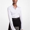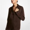 kiiltävä satiini charmeuse lisää kiillotettua elementtiä tähän miesten vaatteiden inspiroimaan toppiin. Hieman rento siluetti leikatussa Hansen-paidassa on terävä kaulus ja osittain piilotetut nappikiinnitykset tyylikkään viimeistelyn takaamiseksi. muotoile se kauden tarkasti räätälöityillä housuilla ja muilla.