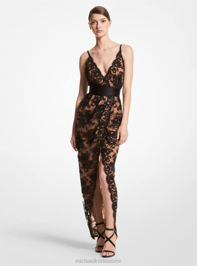 naisellinen ja romanttinen. Tämä näyttävä mekko on huolellisesti valmistettu Italiassa herkästä chantilly-pitsistä ja kirjailtu noir-pailletteilla, jotka korostavat sen monimutkaista kukkakuviota. kapeat olkaimet laskeutuvat uppoavaan pääntieeseen ja vyötärölle, nipistetty vyötärö takaavat imartelevan istuvuuden, kun taas piilovetoketju ja hiekanvärinen vuori antavat kiillotetun viimeistelyn. sen houkutteleva etuhalkio esittelee kauniisti kauden olkaimet.