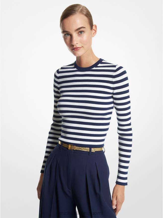 neulotaan keskipainoisesta italialaisesta joustavasta viskoosista. Tässä raidallisessa villapaidassa on uurrettu viimeistely hienovaraista rakennetta ja toiselle iholle sopivaksi. täydennä laivastonvalkoista kuviota yhteensopivilla housuilla.