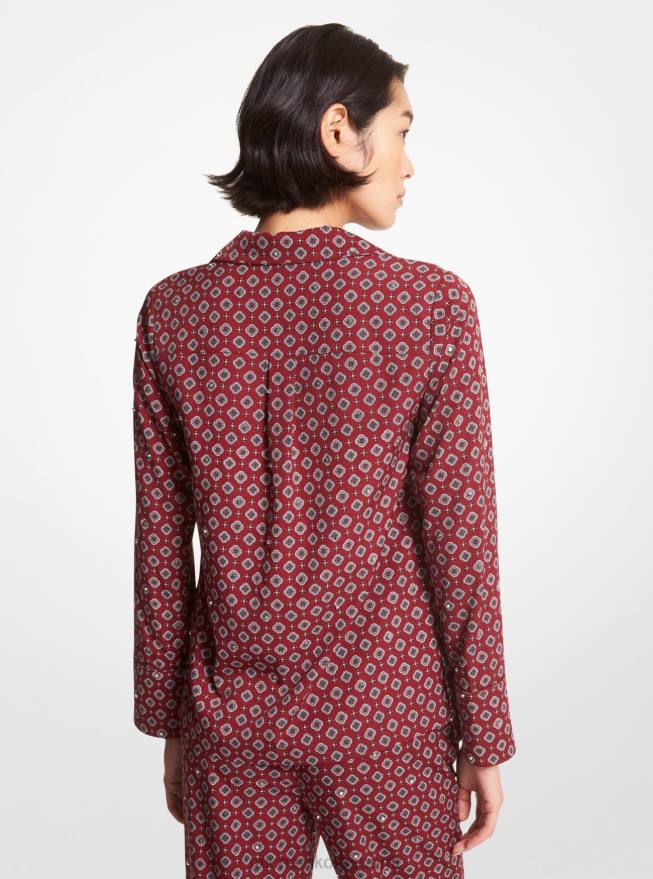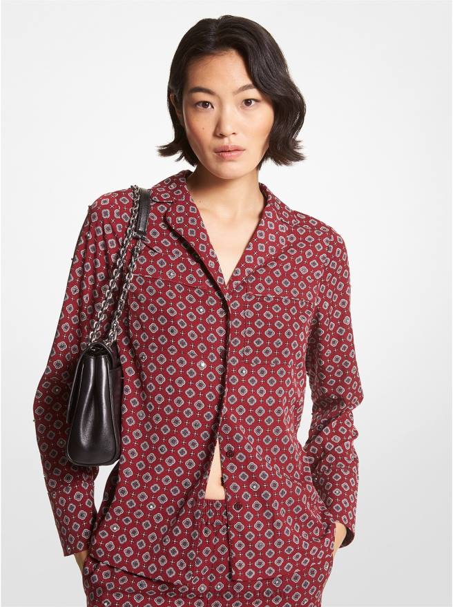 medaljoniprintti ja nastojen yksityiskohdat rinnakkain tämän murskatun kreppipaidan helppouden. käytä sitä yhteensopivien housujen kanssa saadaksesi rennon mutta ylellisen parin.