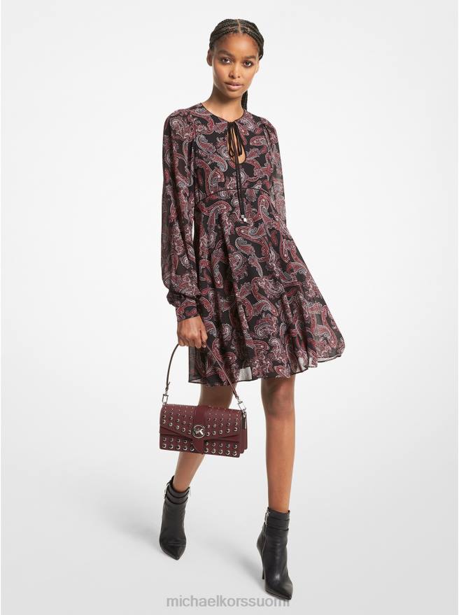 tämä paisley-kuvioinen mekko on täydellinen päivästä iltaan -tyyli, joka nostaa vaatekaappiasi saumattomasti. avaimenreikäpääntie ja empire-vyötärö luovat tuulista georgette-siluettia. lisää vain saappaat viimeistelläksesi lookin.