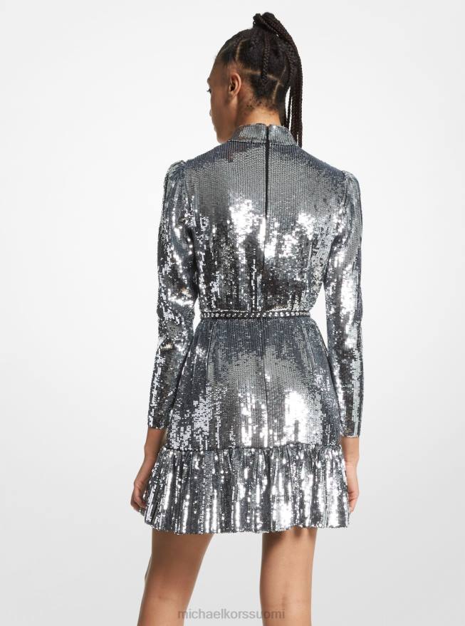 satoilla nestemäisillä paljeteilla korostettuna tämä näyttävä mekko on täydellinen lomajuhlien ilme. pilapääntie ja kevyesti pullistetut olkapäät luovat 80-luvun herkkyyttä, kun taas röyhelöinen minihelma lisää romanttista liikettä. varustaa puristettu vyötärö nastallisella vyöllä.