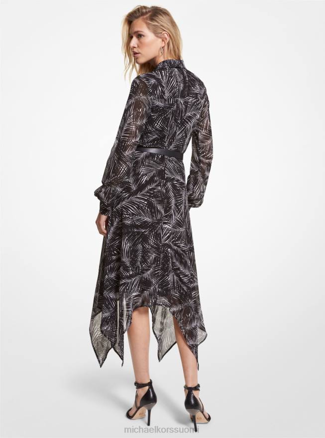 sulava paitamekko luo täydellisen perustan kauden tyylikkäille asusteisiin. Tämä vyöllinen versio on valmistettu osittain kierrätetystä georgettesta ja painettu kämmenkuviolla. korosta nenäliinan helmaa hillityssä sävyssä olevilla sandaaleilla.