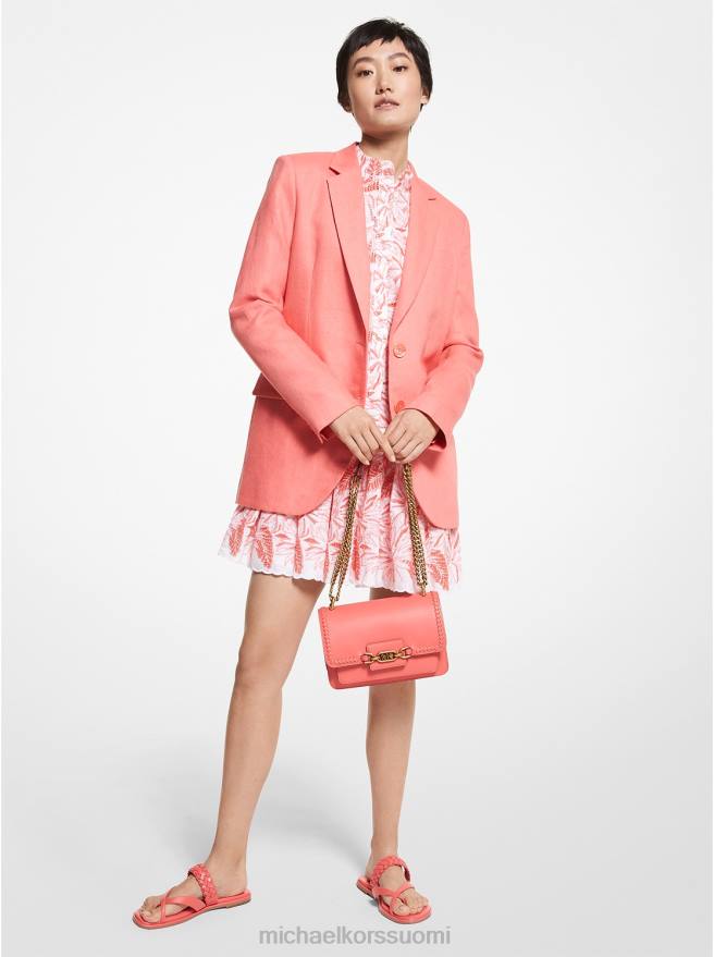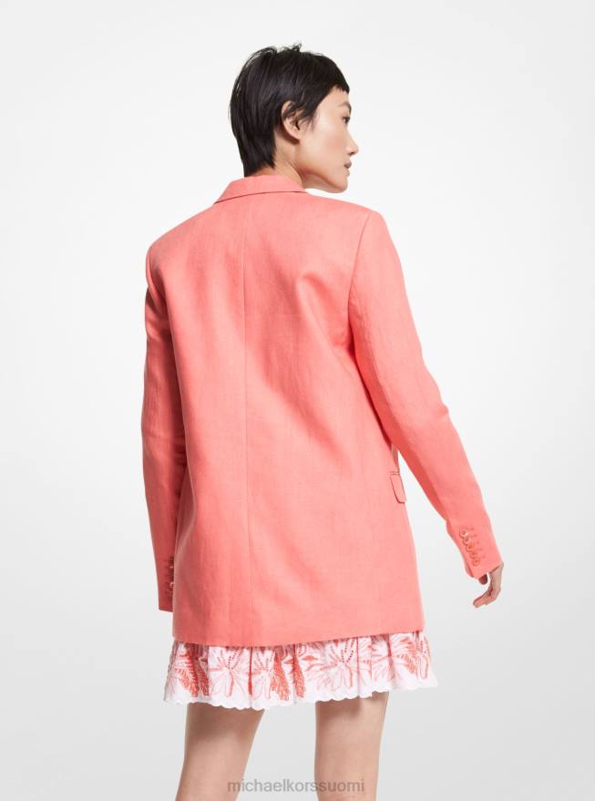 tämä kahdella napilla varustettu bleiseri tekee pukeutumisesta lämpimään ilmaan niin vaivatonta. Se on suunniteltu kerrosystävälliseksi siluetiksi, ja se on leikattu rentoa istuvuutta varten kevyestä pellavasta, joka on pesty pehmeyden vuoksi. täydennä kilpikonnankuoren sävyisiä nappeja ylellisillä neutraaleilla.