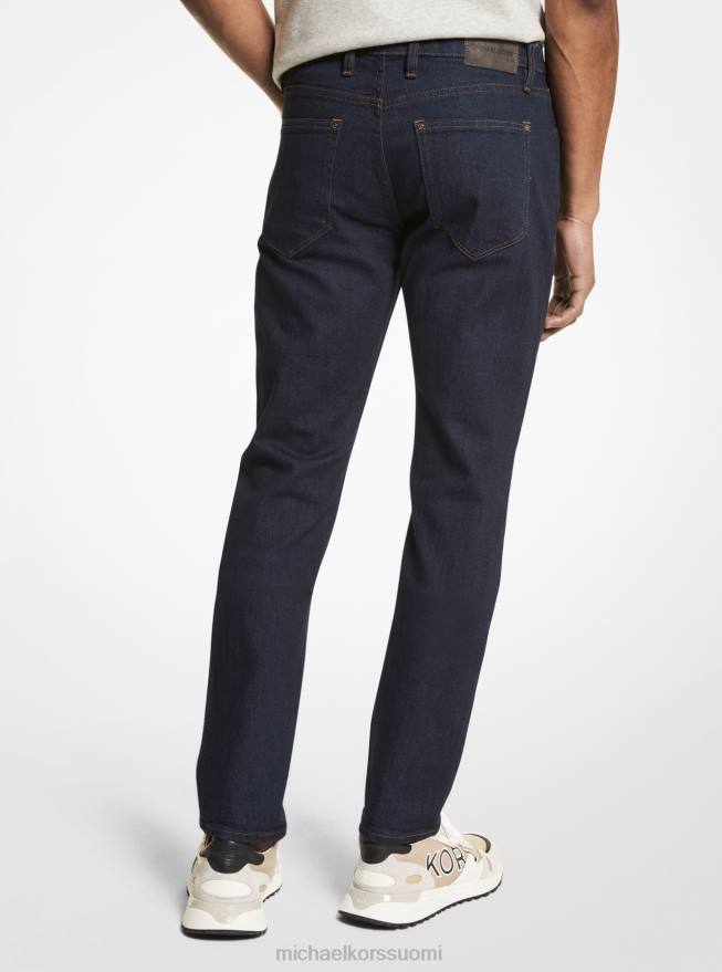 tummassa pesussa nämä siniset farkut on leikattu kapeaksi ja niiden reunoilla on hienovarainen ahdistava. käännä hihansuut ja viimeistele ulkoasu korkeilla tennareilla.