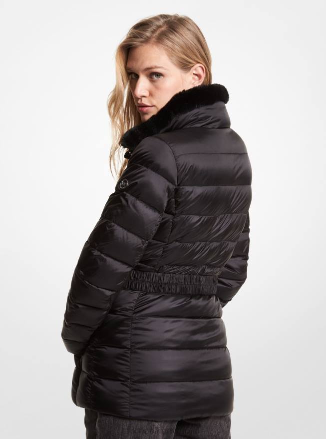 nailonista valmistettu takki esittelee sport-luxe tikattua muotoilua. vyö korostaa kehyksen kapeinta osaa, kun taas tekoturkiksella koristeltu kaulus lisää tuntoon liittyvää mielenkiintoa ja lämpöä. yhdistä ne neuleiden ja farkkukankaiden kanssa.