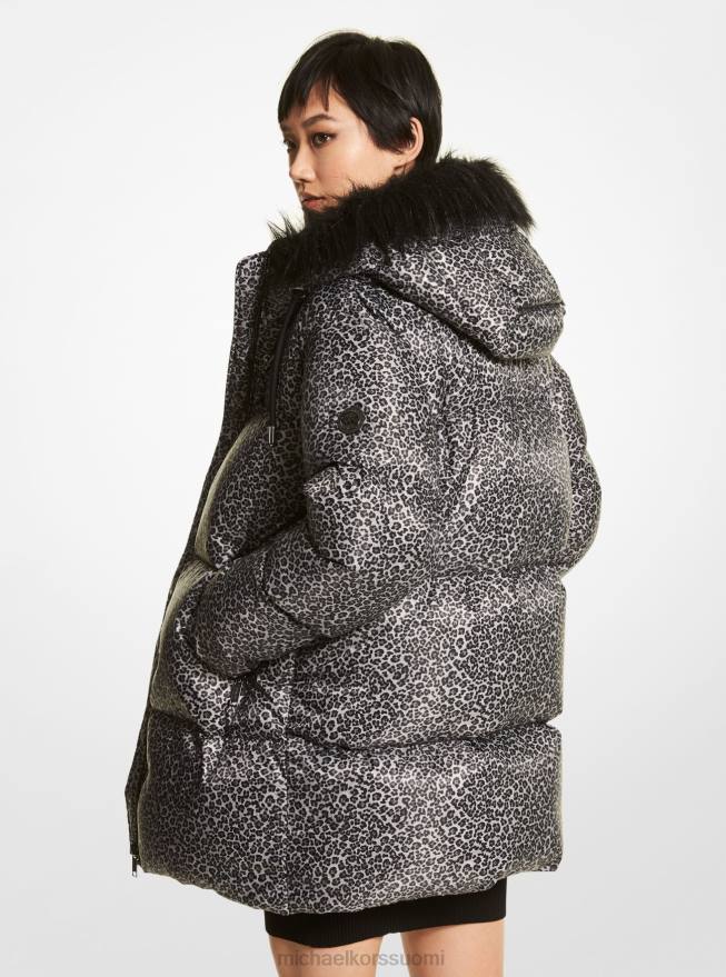 muodin ja toiminnallisuuden yhdistävä leopardikuvioinen ylisuuri puffitakki tarjoaa uskomatonta lämpöä tyylistä tinkimättä. valmistettu kierrätetystä satiinikankaasta, ja siinä on tekoturkiksella koristeltu huppu ja suppilokaulus pitämään reippaat tuulet loitolla. Tikatun rakenteen ja eristävän untuvan ansiosta se on tarkoitettu käytettäväksi vuosien ajan.